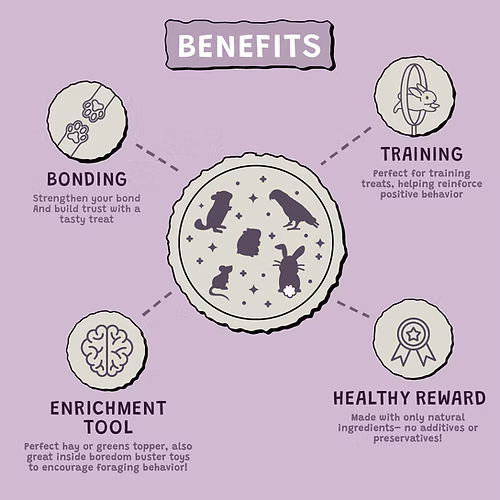 Toutes les friandises sont faites à partir d'ingrédients 100 % biologiques et naturels ! Sans additifs ni conservateurs, sans colorants ajoutés, sans céréales ni noix, et conçues pour que vos amis à quatre pattes puissent profiter de ces délicieuses friandises sans souci.